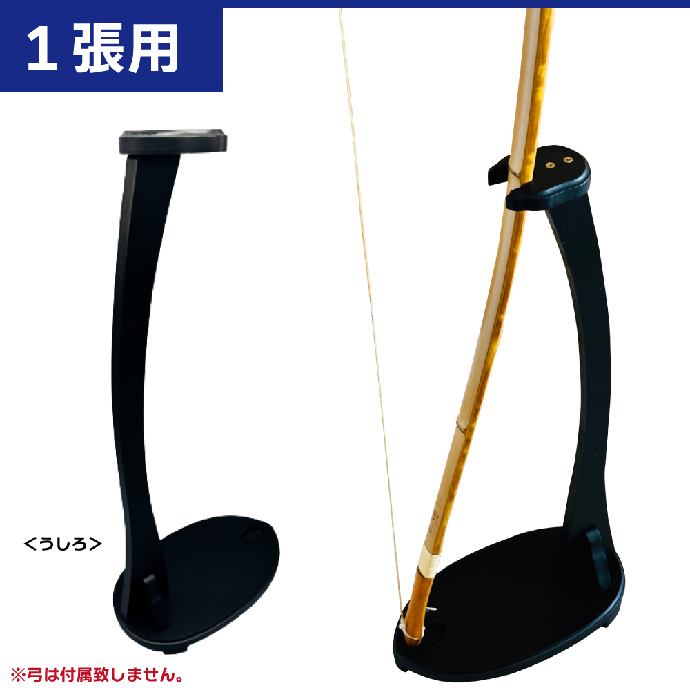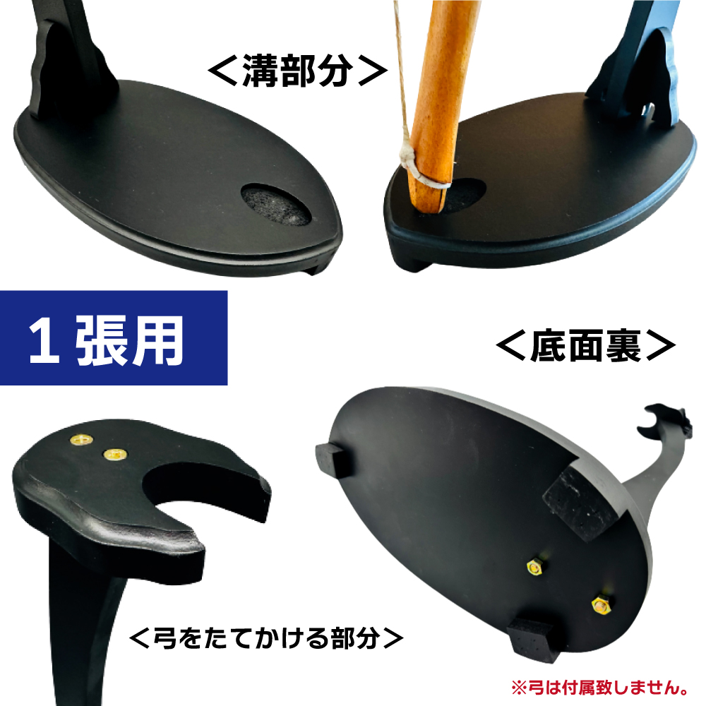 主役である弓を際立たせる黒一色のデザインとなっております。 ※この商品はお取り寄せ品です。 ※シンプルに、溝に弓を立て掛け台座の凹みに本弭を当てる形式となります。 ※弓を溝に対し斜めに置くと傾いてしまいますが、弓を正面から溝に立て掛ければ安定いたします。 ※お客様自身で組み立てて頂く製品です。4 つのパーツを計 4 本のねじ止めで簡単に組み立て可能となります。 | ||||||