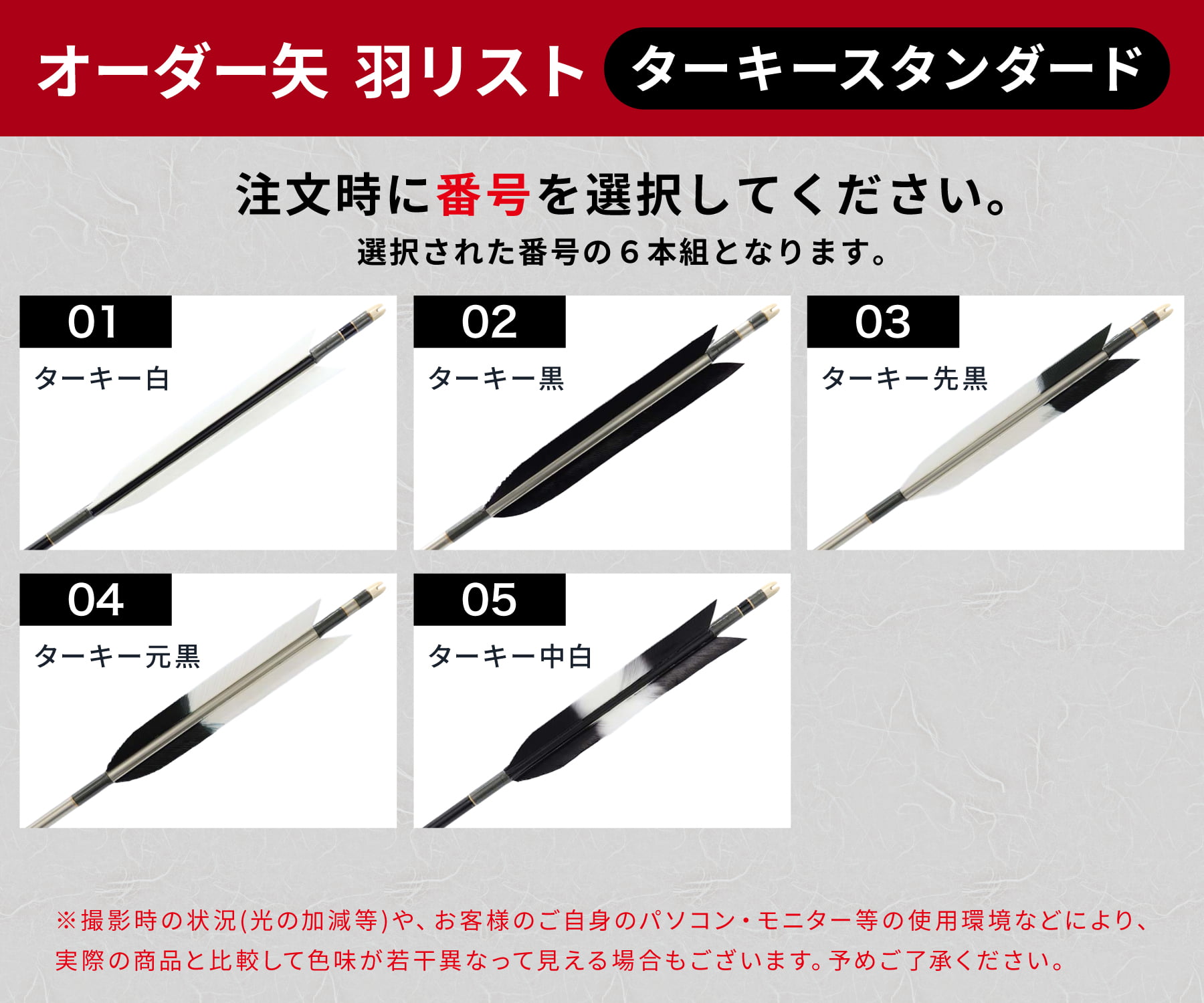 STEP1)シャフトのサイズ (1913/2014/2015) STEP2)シャフトの色 (黒・グレー・シルバー・茶・バンブー) STEP3)羽根の種類 (羽リストから1種類) STEP4)矧ぎ糸か和紙巻き (矧ぎ糸か和紙巻きかどちらかの中から1種類) STEP5)筈の色 天弓筈(白・グレー・黒・クリア・レッド・ブラウン・ブルー) STEP6)矢尺 (初心者の方は矢束プラス10cmから15cm)※指導者によくご確認下さい。 |