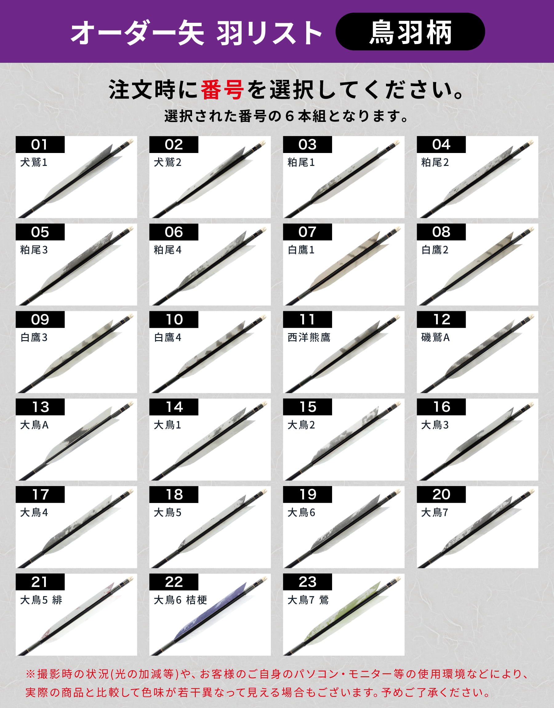 STEP1)シャフトのサイズ (1913/2014/2015) STEP2)シャフトの色 (黒・グレー・シルバー・茶・バンブー) STEP3)羽根の種類 (羽リストから1種類) STEP4)矧ぎ糸か和紙巻き (矧ぎ糸か和紙巻きかどちらかの中から1種類) STEP5)筈の色 天弓筈(白・グレー・黒・クリア・レッド・ブラウン・ブルー) STEP6)矢尺 (初心者の方は矢束プラス10cmから15cm)※指導者によくご確認下さい。 |