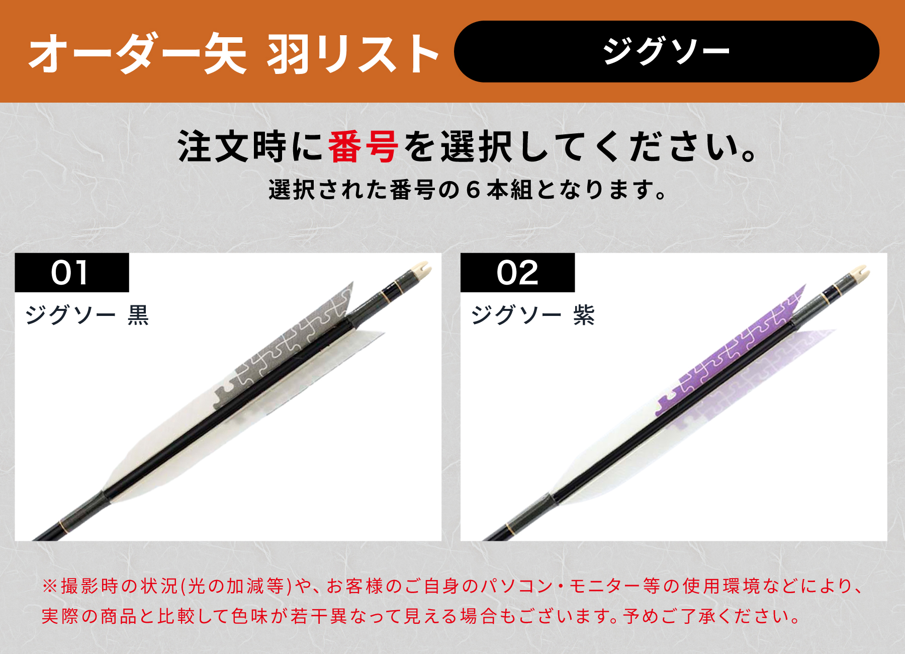 フルオーダー製作矢 1913/2014/2015 ターキー ジグソー 6本組 選べる:羽根(2種)、シャフトカラー(5色)、和紙巻き、矧ぎ糸、筈(7色)【受注生産品】【O-231】 弓道 矢 送料無料