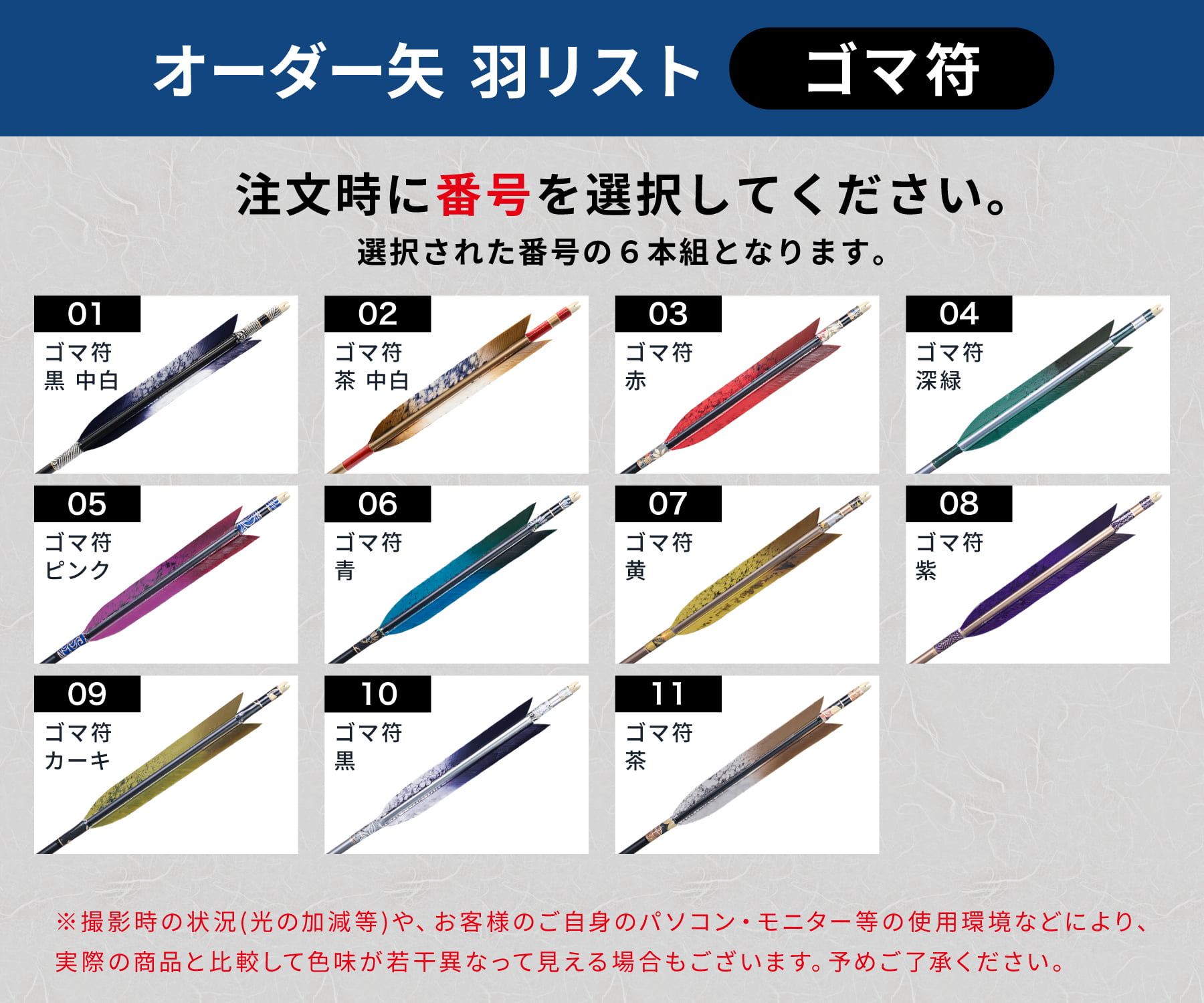 STEP1)シャフトのサイズ (1813/2115) STEP2)羽根の種類 (羽リストから1種類) STEP3)矧ぎ糸か和紙巻き (矧ぎ糸か和紙巻きかどちらかの中から1種類) STEP4)矢尺 (初心者の方は矢束プラス10cmから15cm)※指導者によくご確認下さい。 |