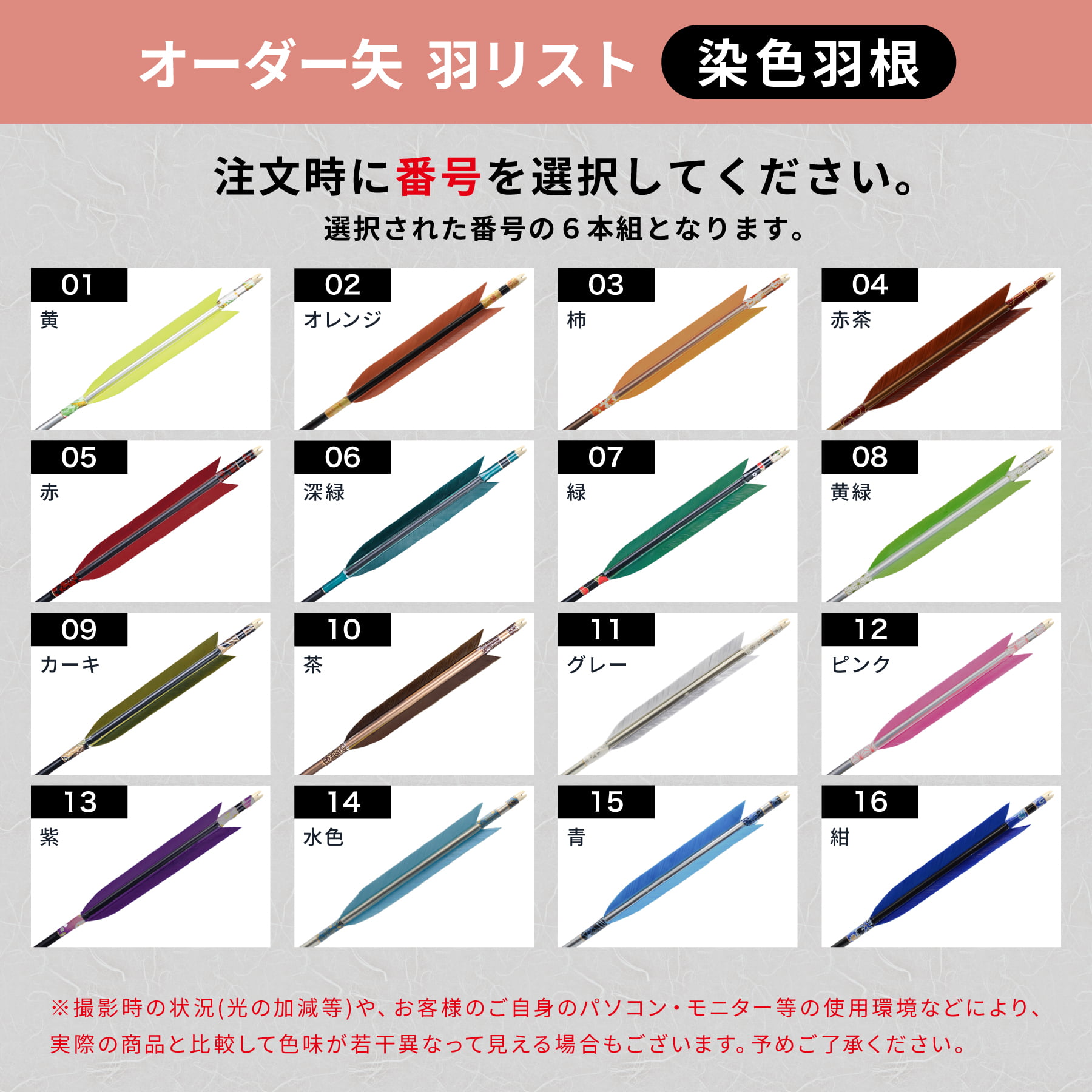 STEP1)シャフトのサイズ (1813/2115) STEP2)羽根の種類 (羽リストから1種類) STEP3)矧ぎ糸か和紙巻き (矧ぎ糸か和紙巻きかどちらかの中から1種類) STEP4)矢尺 (初心者の方は矢束プラス10cmから15cm)※指導者によくご確認下さい。 |