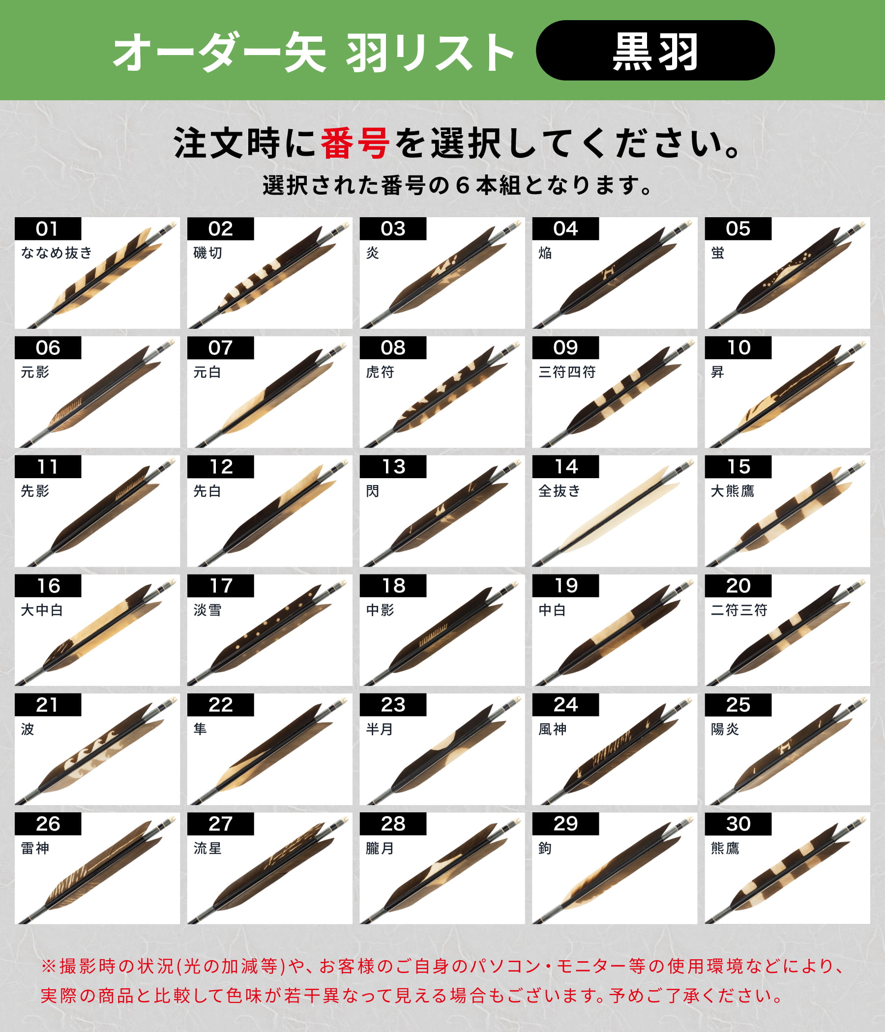 STEP1)シャフトのサイズ (hayabusa 7622/8025) STEP2)羽根の種類 (羽リストから1種類) STEP3)矧ぎ糸か和紙巻き (矧ぎ糸か和紙巻きかどちらかの中から1種類) STEP4)矢尺 (初心者の方は矢束プラス10cmから15cm)※指導者によくご確認下さい。 |